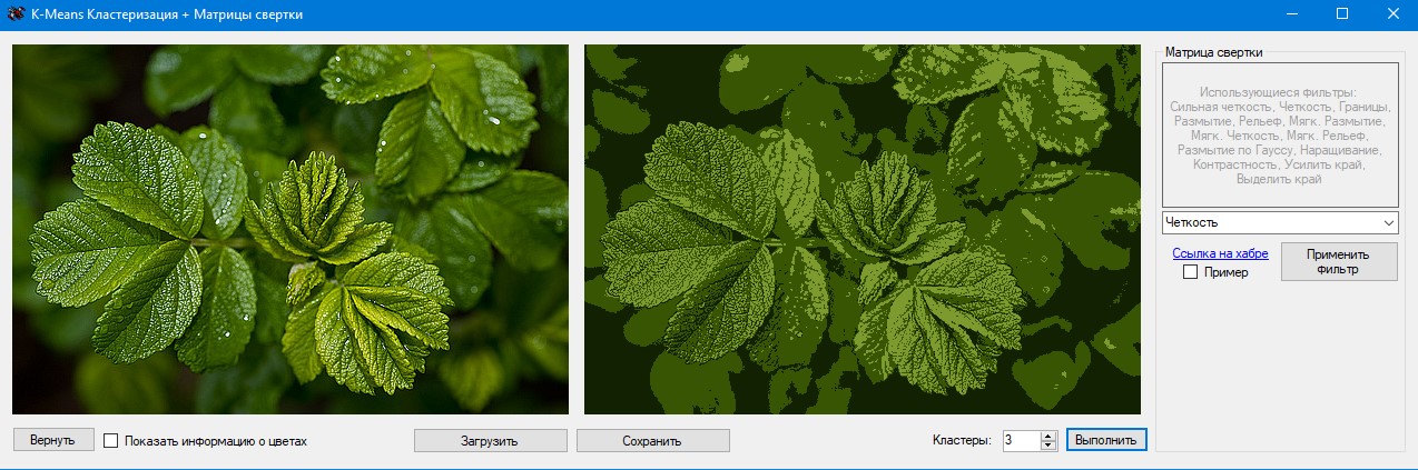 Кластеризация K-means - программа, которой на вход подается изображение, на выходе получается изображение прошедшее кластеризацию методом к-средних. Используются матричные фильтры для обработки исходного изображения.