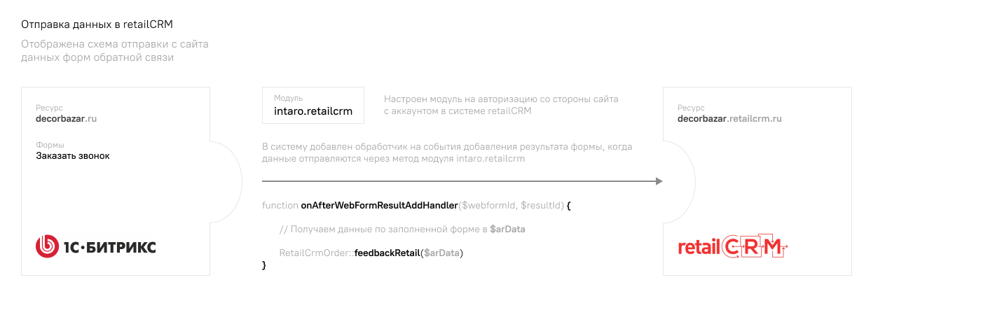Ресурс использует шаблон Аспро. После анализа проекта и задач, на проекте была реализована следующая схема - рис. 1. Используется модуль intaro.retailcrm. Проведен рефакторинг среди событий и обработчиков данных внутри проекта, с целью убрать дублирование кода по обработке данных и написать для результатов форм - один обработчик.