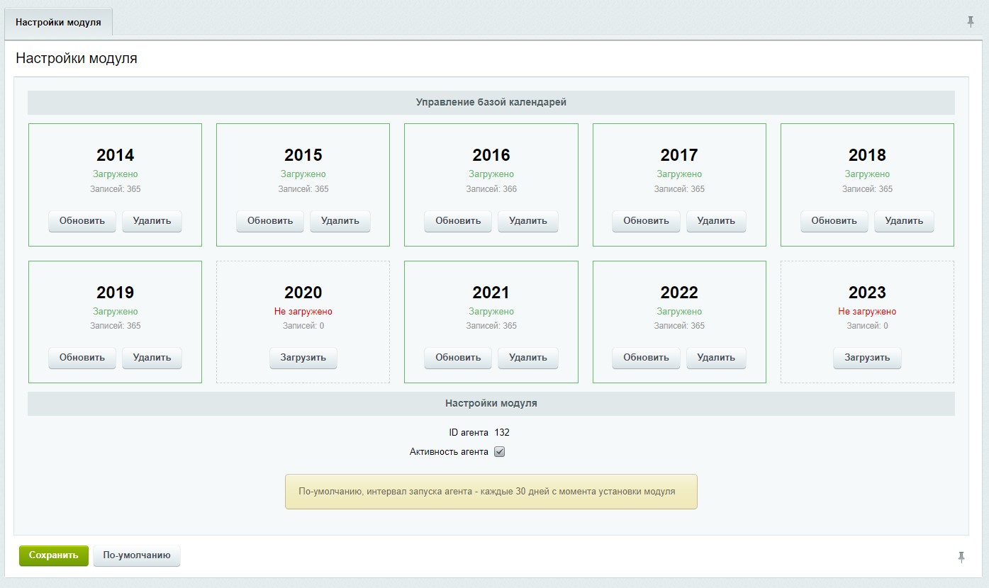 Модуль имеет своего агента, который будет обновлять календари каждые 30 дней. Имеется возможность отключить обновление и оставить только ручное обновление.