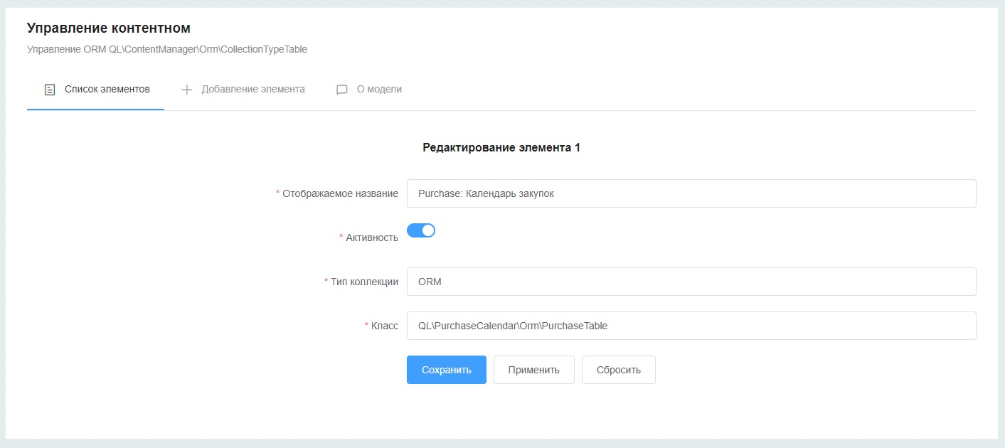 Логика работы такова, что для того чтобы работать с ORM классами - нужно их указать в настройках с коллекциями. Таким образом можно использовать любые ORM классы для редактирования.