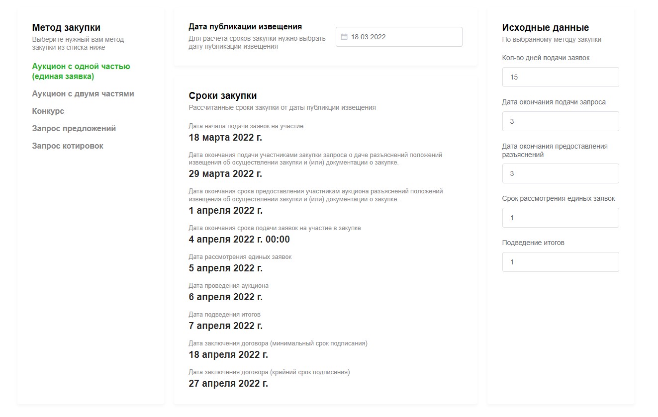 Интерфейс калькулятора состоит из блоков: выбор метода закупки, выбор исходных данных, выбор даты публикации извещения и расчета сроков закупки.
