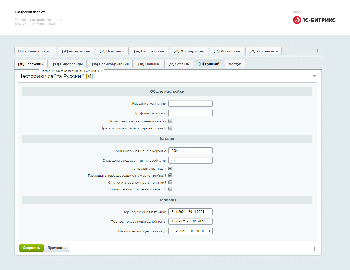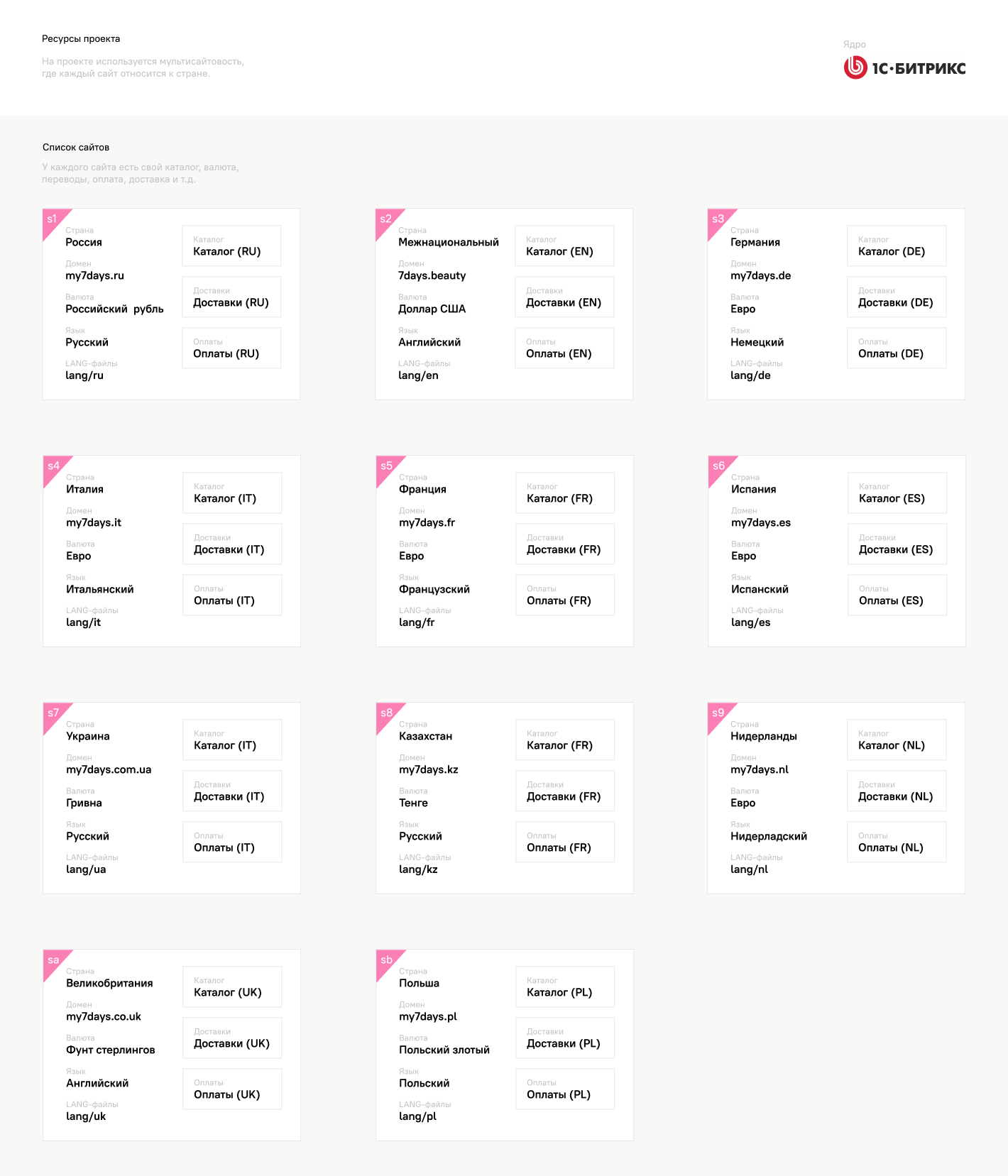 В условиях сохранения CMS Битрикс, было разработано решение для каждой страны, закуплены домены, настроены сервера и разработаны механизмы вывода контента. А также введены для проекта разделенные свойства и параметры сайтов, например свое навзвание компании (ООО, LLC, Ltd), свои ленты инстаграмма, свои соц.сети, свои каталоги, свои данные по оплатам, доставкам и, свои периоды событий (новый год, черная пятница, 8 марта, каникулы). Где-то отключена возможность покупки, и оставлен просто каталог, для подачи на сертификацию.