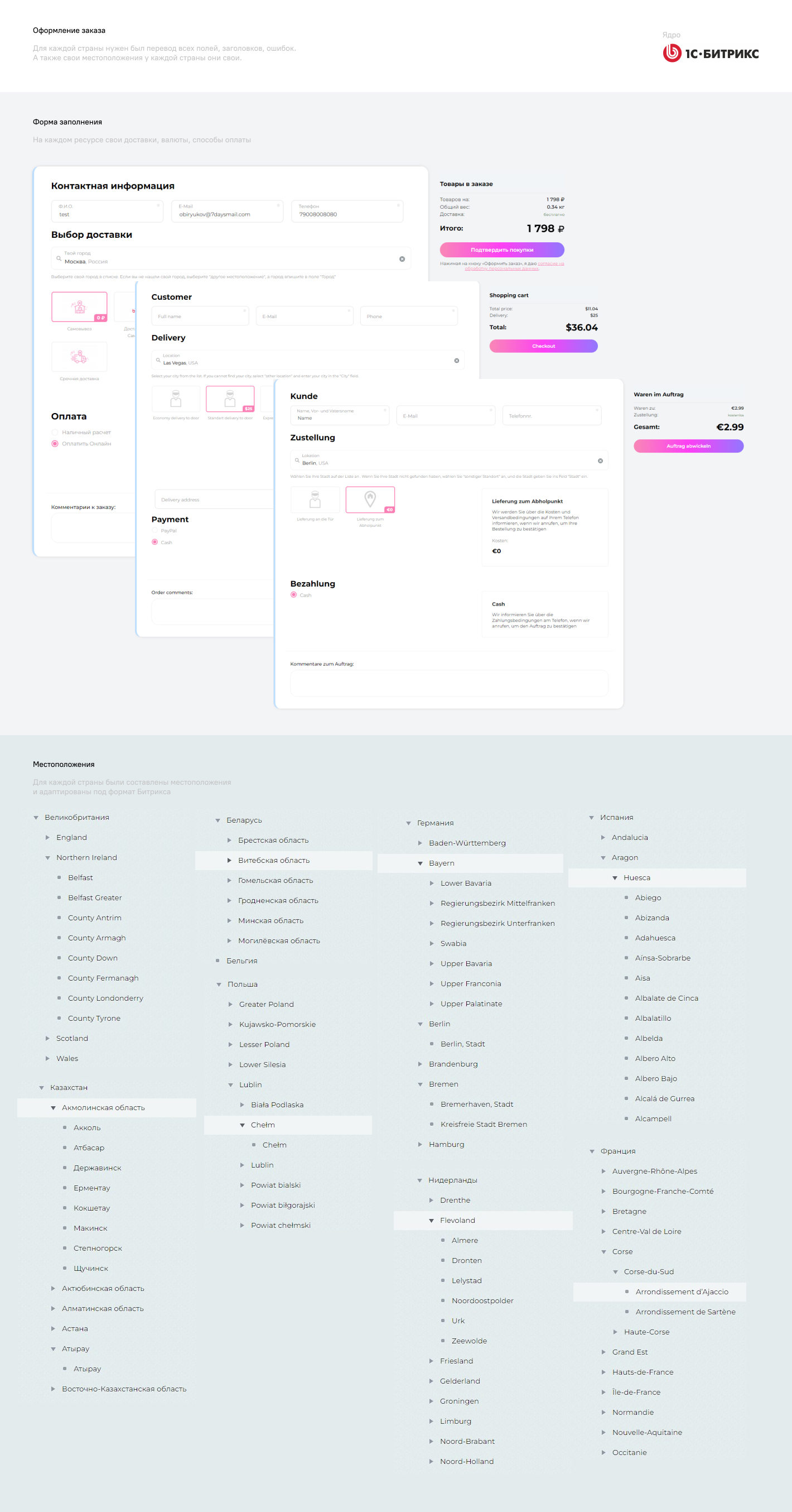 Для каждой страны был собран справочник, состоящий из индексов, адресов, административных и территориальных делений и адаптирован под формат импорта в битриксовые местоположения. Информация не собиралась вручную, а были использованы международные базы данных по почтовым адресам. И на основе этих адресов, была составлена структура данных и ее модель была перенесена в плоскую структуру данных для подсовывания системе при импорте данных.