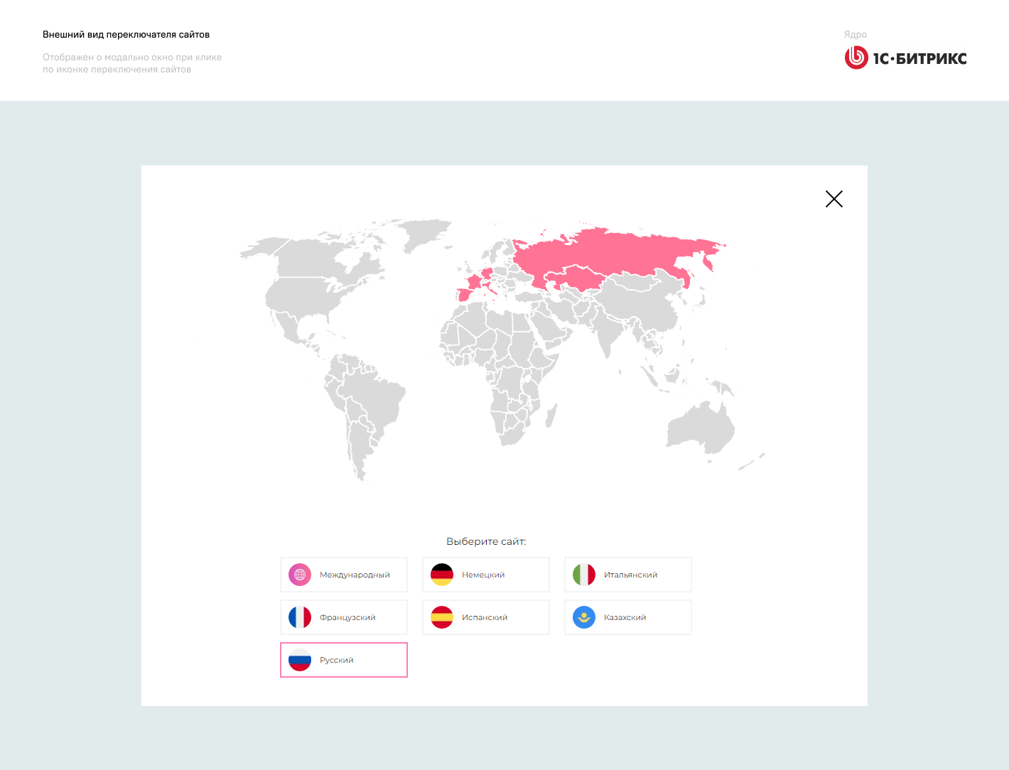 Когда проекту потребовалось деление на несколько сайтов, возникла идея поместить переключатель между сайтами. По началу переключатель был в виде выпадающего списка, там было всего 2 сайта - Русский и Английский. Но со временем список стал расти и я предложил идею - выносить переключение в модальное окно. Поскольку каждый сайт предполагает привязку к одной стране, то также возникла идея использовать карту мира, на которую переносить охваченные страны по сайтам.