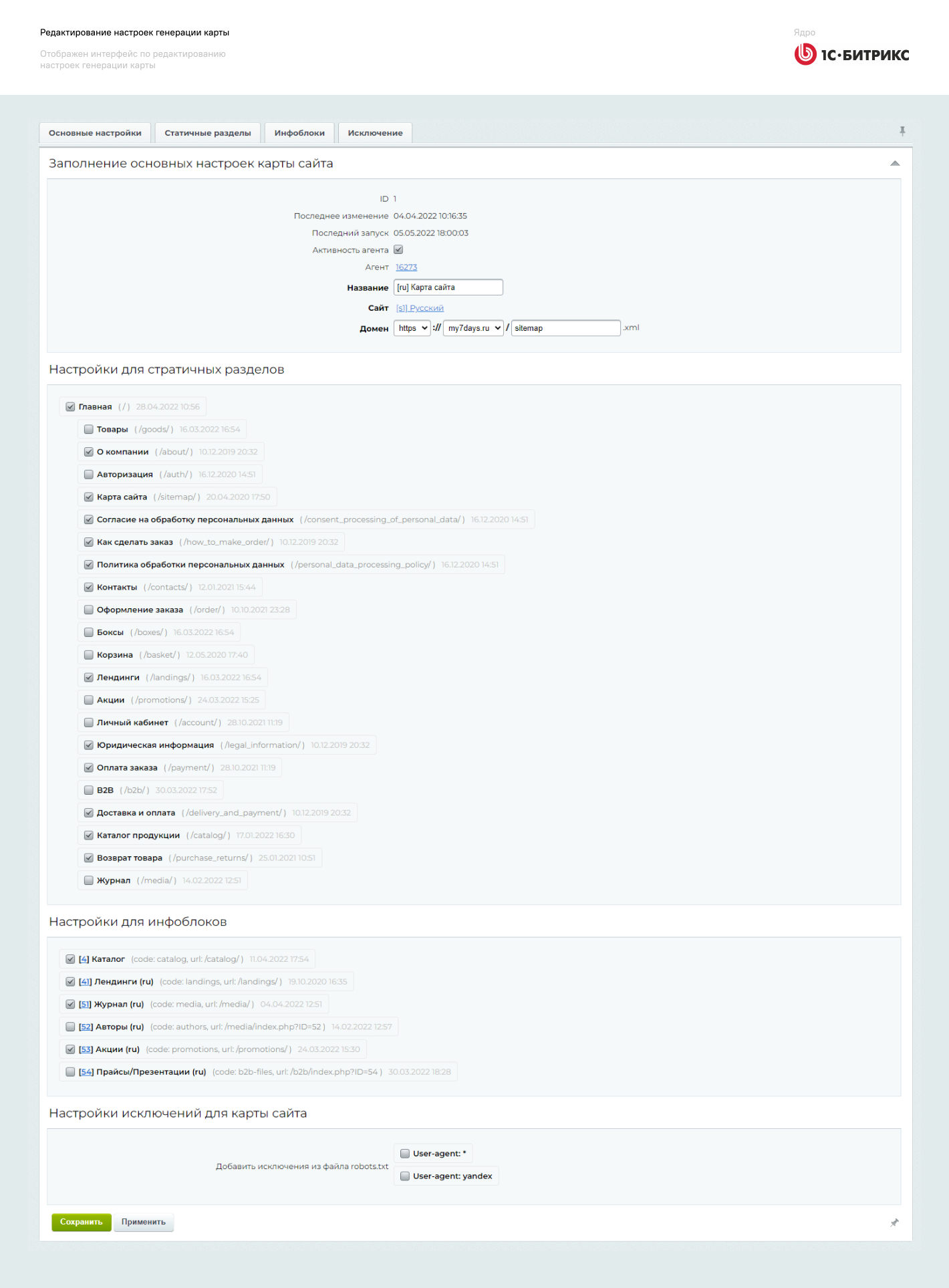 В основе генерации лежат внесенные пользователем данные по статическим и динамическим данным. Под статикой подразумеваются обычные разделы сделанные через статические файлы (index.php + .section.php), под динамикой - правила для инфоблоков. Исключения можно завать через файл robots.txt (каждое правило можно как выбрать, так и исключить), сам файл берется из корня сайта.