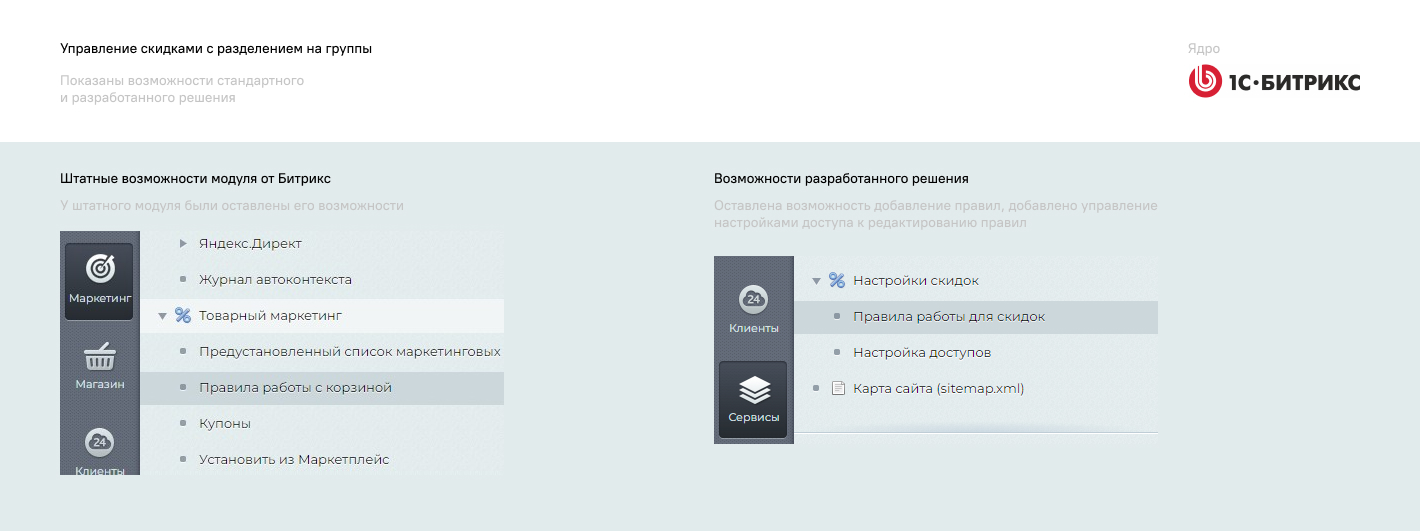 Для этого был скопирован штатный модуль и выпилены лишние возможности, которые для данной задачи не нужны. Переработан фильтр с выборкой правил работы с корзиной и перенесено все в новый раздел - Сервисы - Настройки скидок.