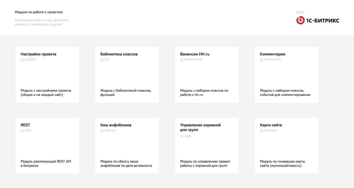 Для проекта были разработаны несколько модулей. По хорошему, можно вычленить еще несколько вещей в отдельные модули, но это вопрос свободного времени.