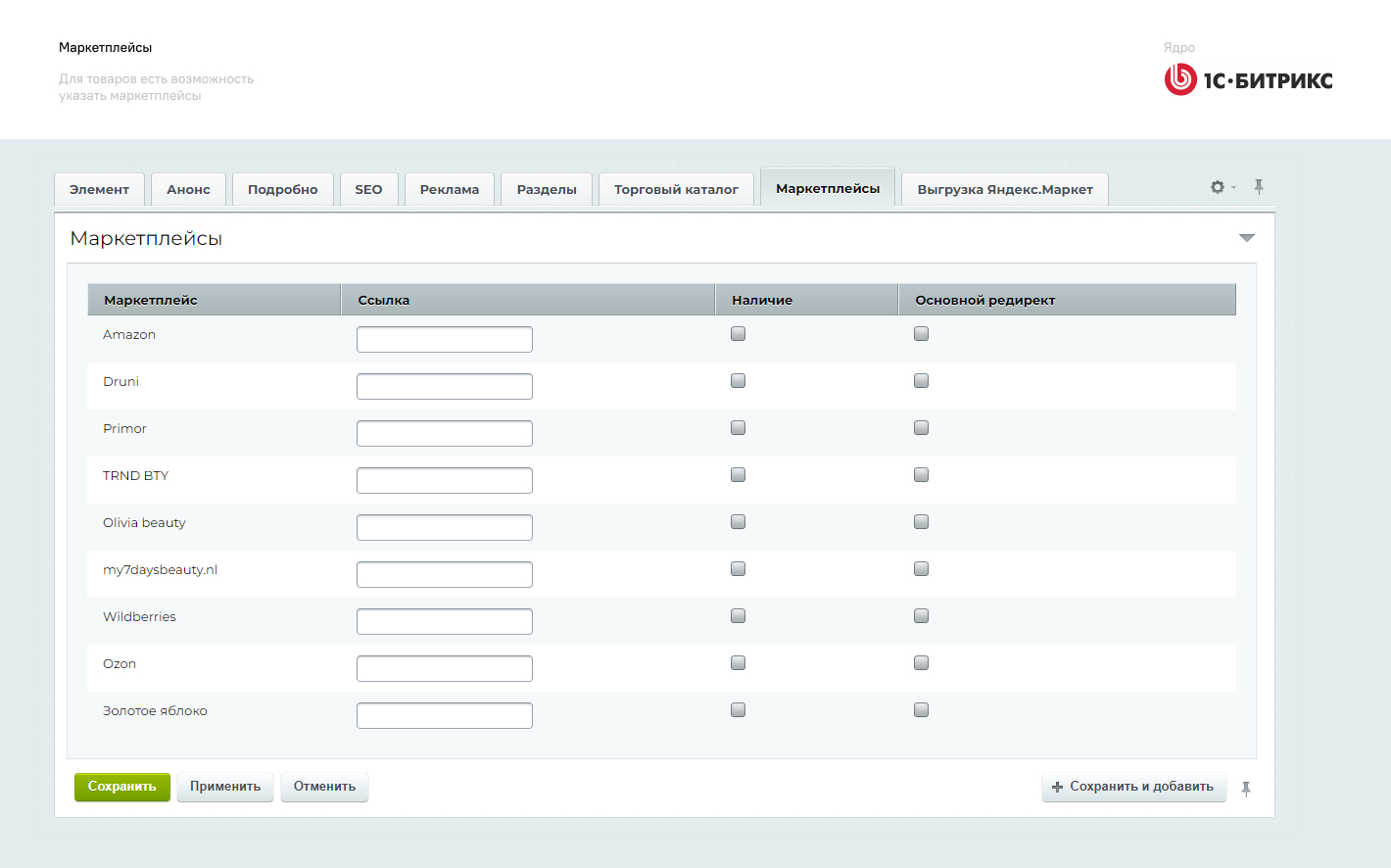 Сами маркетплейсы задаются в highload-блоке, туда также заносится код и иконка маркетплейса в формате svg, для дальнейшего вывода на странице с товаром кнопок с дополнительными ссылками на маркетплейсы.