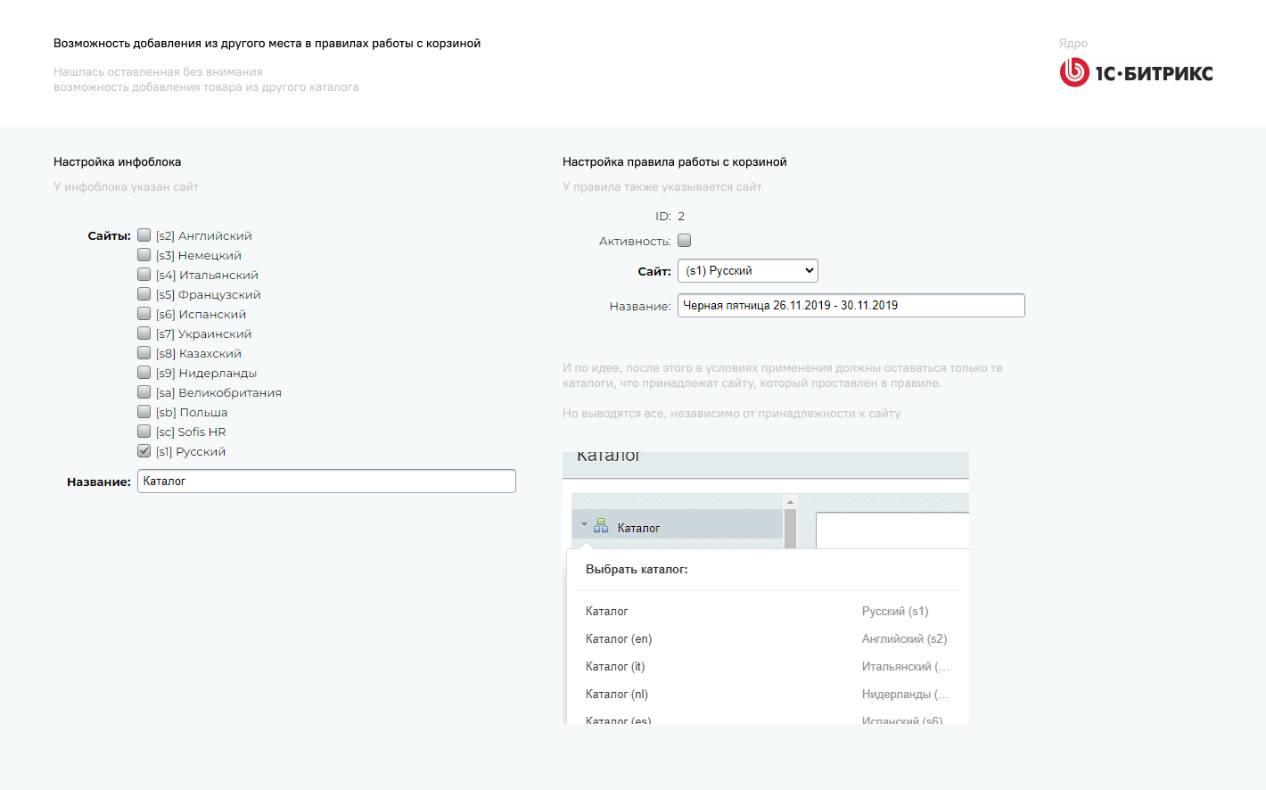 Поскольку проект имеет одно ядро, то и штатные модули маркетинга не все имеют поддержку мультисайтовости. В данном проекте нужно было разделить штатные правила работы с корзиной на группы и на сайты, дать права группам на доступ и редактирования только тех правил, которые принадлежат их сайтам.