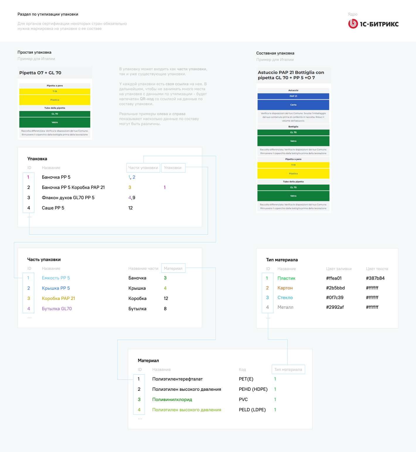 Разработанный раздел нужен в основном для служебных целей. Возникла ситуация, когда на составных упаковках нужно выводить части, их материал и тип материала (либо цветом, либо текстом). Поскольку составных частей может быть несколько, то размер таблиц с данными по утилизации может быть объемным на упаковке. Поэтому разработана схема, когда на упаковку размещается ссылка на ее состав в виде QR-кода. Зайдя по ссылке - пользователь увидит ее состав. Это экономит место на упаковке, особенно для мелких упаковок с составными частями, где было бы проблематично все указывать.