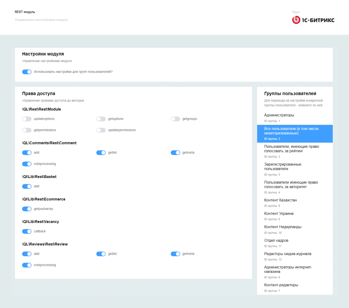 Разработан интерфейс для модуля с использованием Vue и ElementUI. В интерфейсе отображены доступные методы для зарегистрированных CRestProvider'ов. У каждого метода может быть своя настройка прав доступа группы пользователей. После разработанного модуля, начался частичный рефакторинг всей темы, и переход на rest.