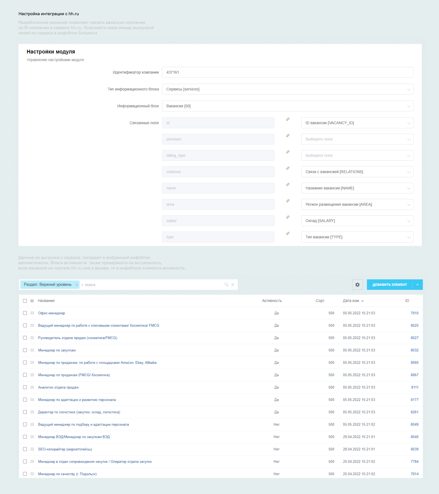 - По проставленным связям, между полями платформы и инфоблока, данные записываются в элементы инфоблока. Если элемент существует (это определяется по ID вакансии с платформы), то данные перезаписываются, иначе будет создан элемент с данными по вакансии